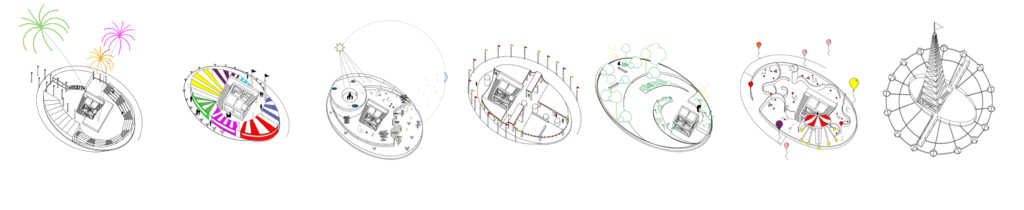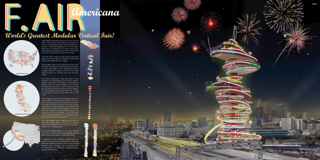 …The f.AIR AMERICANA enhances the positive qualities of the county fair, and the amusement, but uses the verticality to save from space, energy, as well as making it accessible by locating it in publicly accessible centers and near transportation hubs…