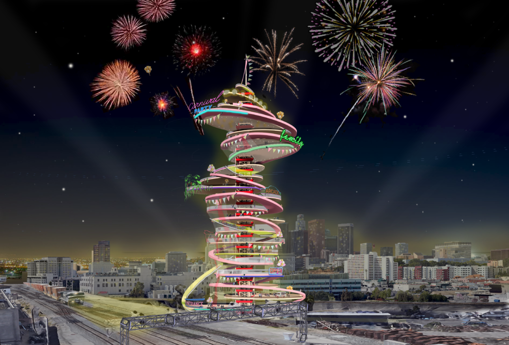 The f.AIR AMERICANA settles itself in the existing infrastructure: The US Railroads. The United States has a history of established railroad system. The f.AIR AMERICANA sets up itself in Downtown Los Angeles, near the Union Train Station. The connection with the railway serves two purposes: Each of the modules of the vertical fair can be carried on the train and be set up on-site, and then deployed to take the fair to another city. Secondarily, the proximity to train station makes it easily accessible for the communities who do not necessarily have the luxury of private transportation be able to reach it, with poor local community in more impoverished sites nearby.