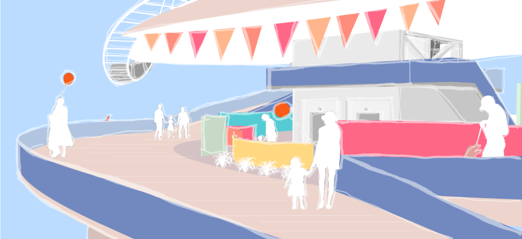 The sizing of these modules is done by improving the needs of each program, and pieces of the each module is also optimally sized for transport via train freights. The sample size is 40 feet by 9 feet. For assembly and dis-assembly, all the individual pieces of the module can be bolted, and when transporting the fair to another city they are taken to train tracks as well.