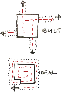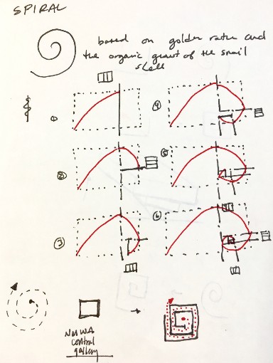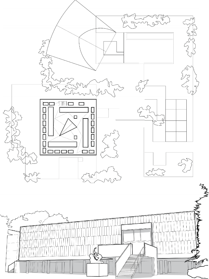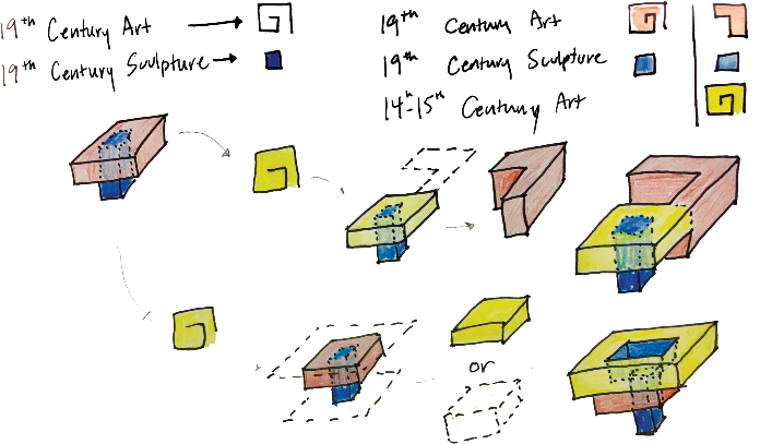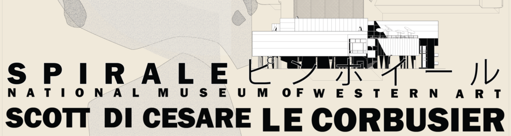 There are a few initial challenges with the diagram and the building. The diagram consists of the intersection of a spiral and a pinwheel. The combination of these two basic diagrams are juxtaposed and create a conflict of circulation, growth, expansion, entrance, and exit. Additional issues occur when the idealized building and diagram are imposed with a non-ideal program and site. The program of the Museum of Western Art began with 19th century art, a very narrow scope for growth. The clash of program and building create an opportunity for improvement in the finalized thesis project.