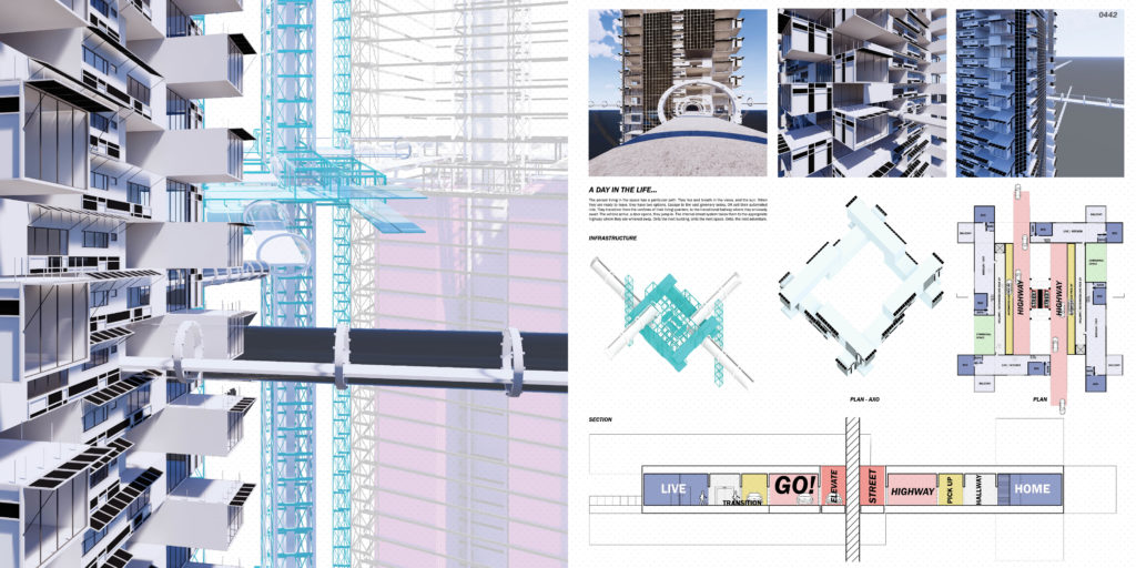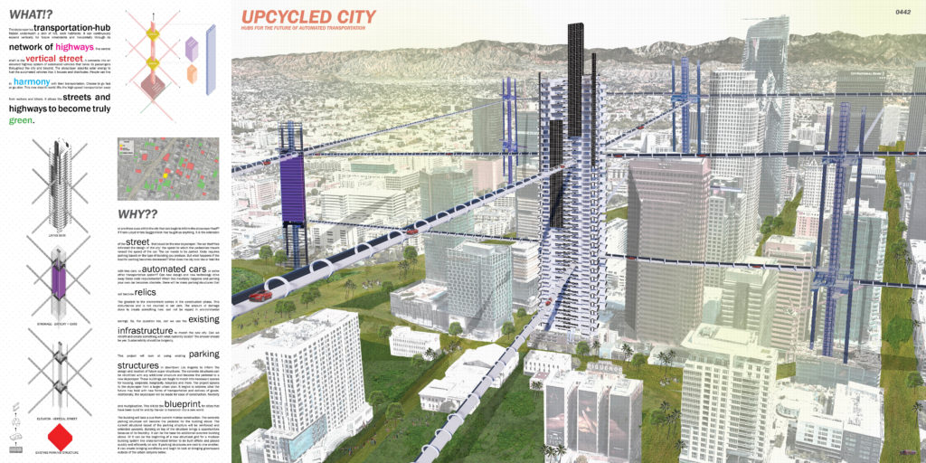 The proposed skyscraper is a transportation hub hidden underneath a skin of live+work habitants. It can continuously expand vertically for future inhabitants and expand horizontally through its network of elevated highways. The central shaft is the vertical street. It connects to an elevated highway system of automated vehicles that takes its passengers throughout the city and beyond. The skyscraper absorbs solar energy to fuel the automated vehicles that it houses. People can live in harmony with their transportation. The users can choose to go fast with the elevated automated vehicular transportation system or go slow in the newly formed elevated living planes. This new electric world lifts the high-speed transportation away from walkers and bikers on the ground level. It allows the streets and highways to become truly green.